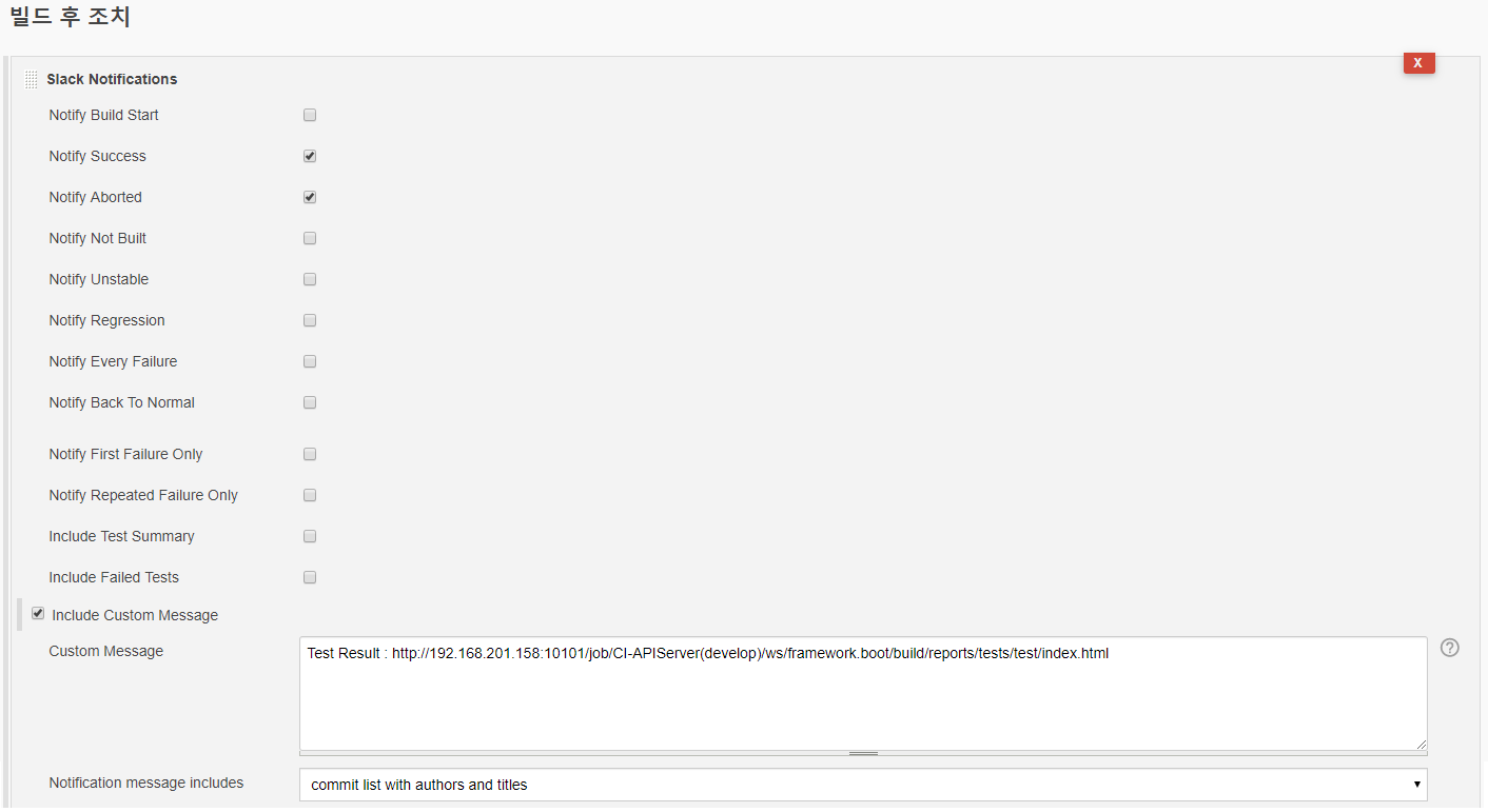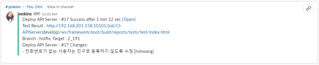 - Jenkins는 Slack으로 빌드 결과, 테스트 결과, Commit log를 알린다.