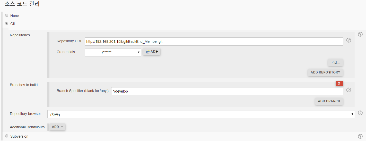 Repositories에 Git 서버 정보를 설정하고 빌드할 branch를 설정합니다.